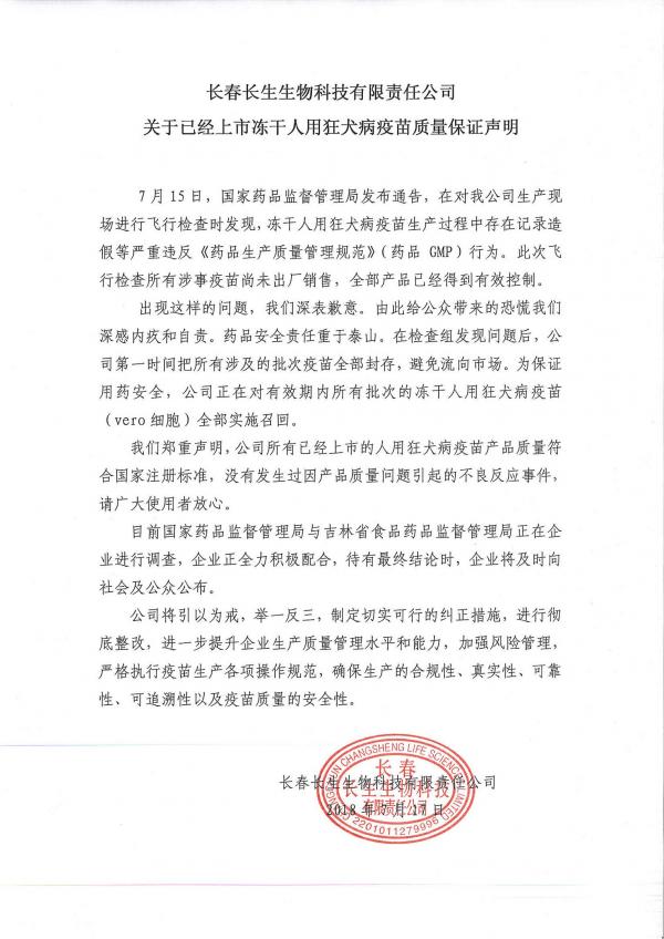 西安兵马俑在线7月17日讯 中新网7月17日电 长春长生生物科技有限责任公司今日在官网发布《关于已经上市冻干人用狂犬病疫苗质量保证声明》。声明指出,所有涉事疫苗尚未出厂销售,全部产品已经得到有效控制。公司所有已经上市的人用狂犬病疫苗产品质量符合国家注册标准,没有发生过因产品质量问题引起的不良反应事件。
