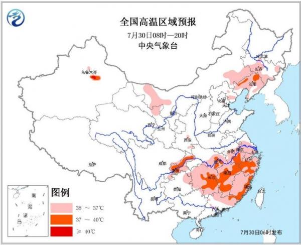 未来三天南方地区高温范围减小,强度减弱,北方地区高温加强。中央气象台7月30日06时继续发布高温黄色预警:预计7月30日白天,四川东部、重庆、江汉南部、江淮南部、江南、华南东北部及新疆吐鲁番盆地、内蒙古西部和东南部、东北地区中南部等地最高气温有35~36℃,其中,重庆北部和中西部、湖北东部、湖南东部、江西大部、浙江中南部、安徽南部、福建东部、辽宁北部以及吐鲁番盆地等地的部分地区最高气温37~39℃,局地可达40℃。