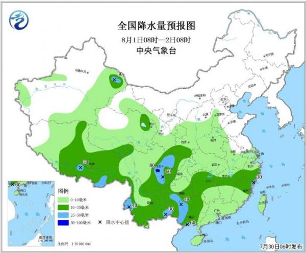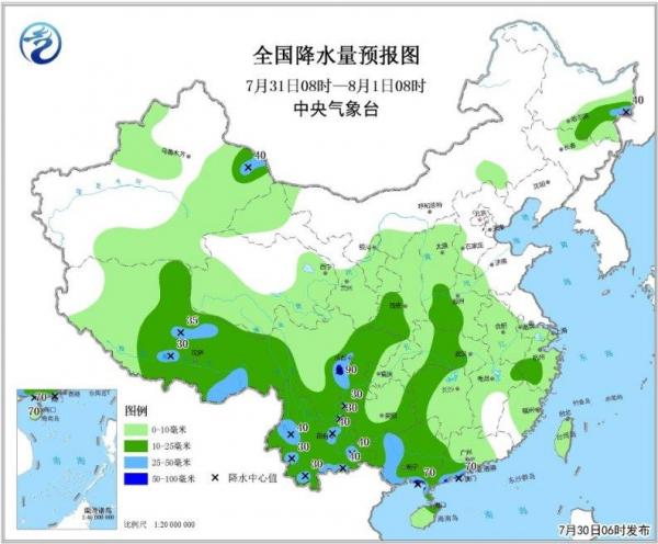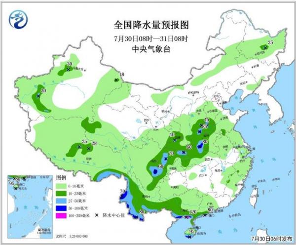 图2 全国降水量预报图(7月30日08时-31日08时)
