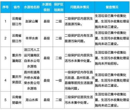 督查发现的主要问题:5个饮用水水源地环境问题整治工作滞后,水源保护区内居民生活污水未经有效处置,有关生活污水收集处理设施尚未动工建设。主要涉及云南省丽江市(2个问题)、重庆市潼南区、重庆市荣昌区、云南省楚雄州各1个问题(详见附件)。