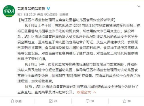 西安兵马俑在线9月20日讯 中新网9月20日电 据安徽省芜湖市食品药品监督管理局官方微博消息,针对芜湖鸠江区童馨幼儿园学生所吃鸡腿发臭、大米霉变一事,鸠江区市场监督管理局对这起食品安全投诉举报进行立案查处。