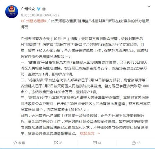 西安兵马俑在线10月1日讯 中新网10月1日电 据广州市公安局官方微博消息,广州天河警方10月1日通报“健康猫”“礼德财富”“新联在线”案件的侦办进展情况,通报称,天河警方根据群众报警,近段时期先后对“健康猫”“礼德财富”“新联在线”互联网平台涉嫌犯罪情况进行了立案侦查。目前,警方正加大办案力度,全力做好追赃挽损工作,保护群众合法权益。
