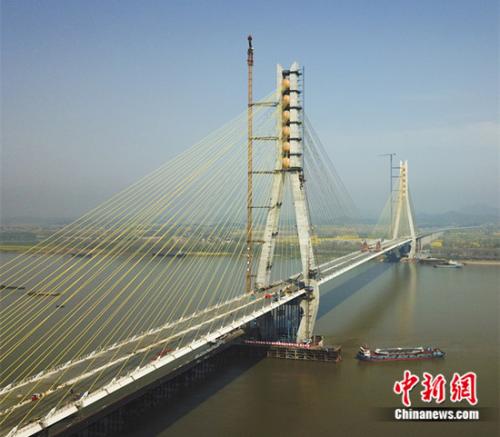 池州长江公路大桥跨江主通航孔桥为主跨828米的不对称混合梁双塔斜拉桥,高达243米相当于90层楼的南岸主塔高耸入云。