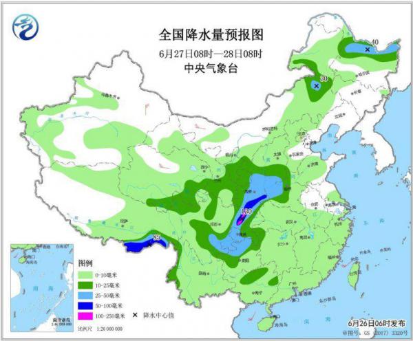 图1 全国降水量预报图(6月26日08时-27日08时)