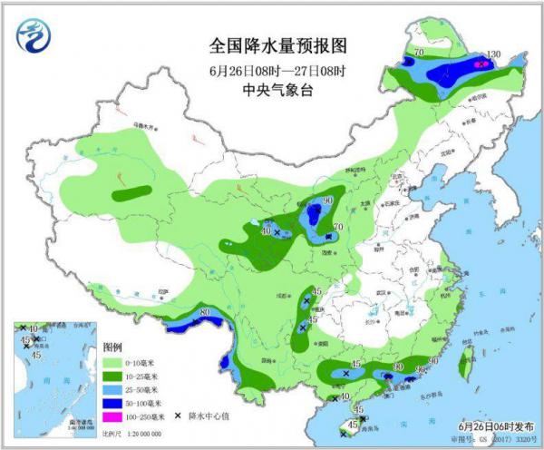 6月26日08时至27日08时,内蒙古东部、黑龙江中部和东北部、西藏东南部、西北地区东北部和中部、云南西南部、华南中北部和南部等地的部分地区有中到大雨,内蒙古东北部、黑龙江中部、西藏东南部、宁夏东北部、云南西南部等地的部分地区有暴雨或大暴雨(100~130毫米)。南疆盆地和新疆北部、甘肃河西和中部、山西中部等地的部分地区有4~5级风(见图1)。