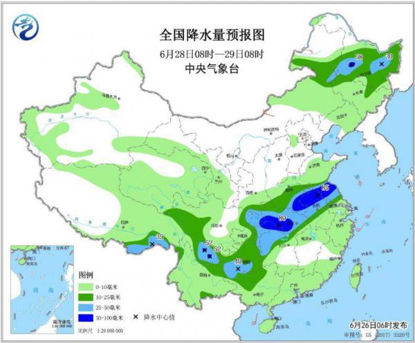 图3 全国降水量预报图(6月28日08时-29日08时)