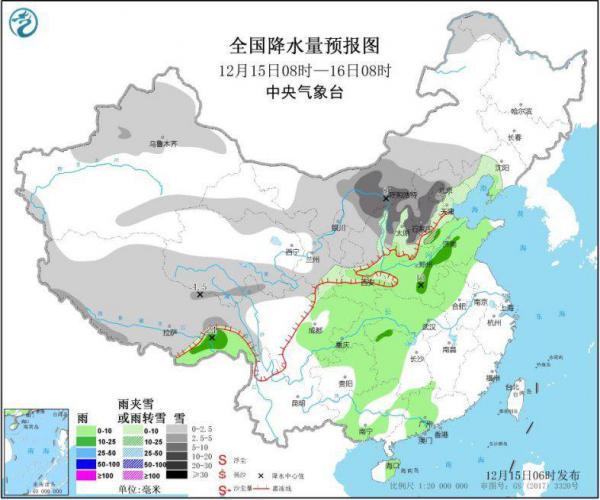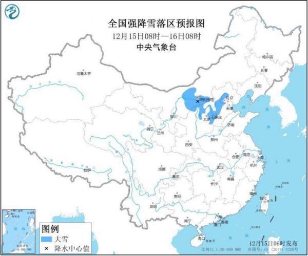 12月15日08时至16日08时,新疆北部、西北地区中东部、华北西部和北部、青藏高原等地有小到中雪或雨夹雪,其中,内蒙古中部、陕西北部、山西西北部和东部、河北西部、北京西部和北部等地有大雪(5~8毫米)。华北南部、黄淮、江淮西部、江汉、西南地区东部、华南中西部、西藏东南部等地有小雨,局地中雨。