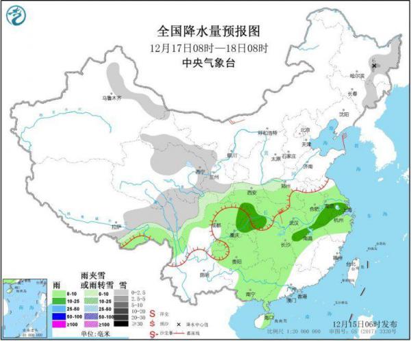 12月17日08时至18日08时,新疆沿天山地区、黑龙江东部、吉林东部、西藏东部、西北地区中部和东南部、川西高原北部等地部分地区有小雪或雨夹雪,其中,黑龙江东南部部分地区有中雪,局地大雪(5~6毫米)。西藏东南部、陕西南部、西南地区东部、黄淮西部、江淮大部、江汉、江南大部、华南西部等地部分地区有小雨,其中,江南北部、四川盆地东北部部分地区有中雨。内蒙古河套地区、湖北中东部等地部分地区有4~5级风。