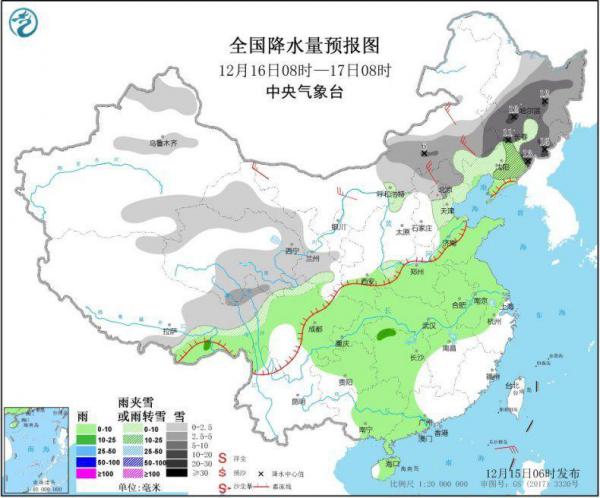 全国降水量预报图(12月15日08时-16日08时)