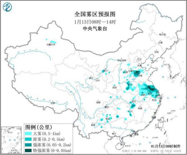 13日早晨至上午,江苏中南部、安徽中北部、山东西北部、河南中部、湖北东南部、湖南东部等地的部分地区有大雾,其中,江苏中部、山东西北部、湖南东北部等地的部分地区有能见度不足200米的强浓雾,局地能见度不足50米。中央气象台1月13日06时继续发布大雾黄色预警。