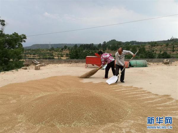 在山西省运城市平陆县杜马乡贤良村,农户在晾晒收获的小麦(5月29日摄)。 新华社记者 王飞航 摄
