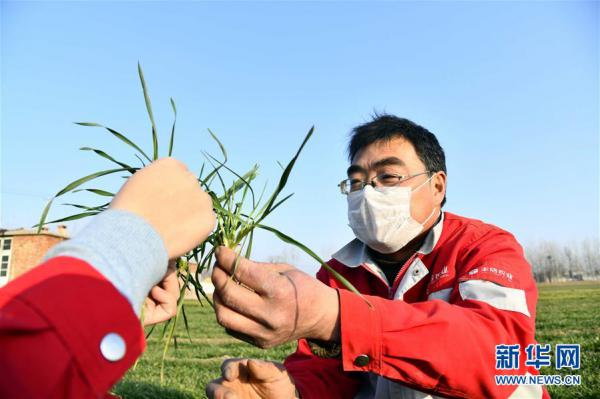 在山东省泰安市宁阳县葛石镇大夏庄村,山东丰信农业科技开发有限公司的工作人员在查看农作物长势(2月13日摄)。 新华社记者 郭绪雷 摄