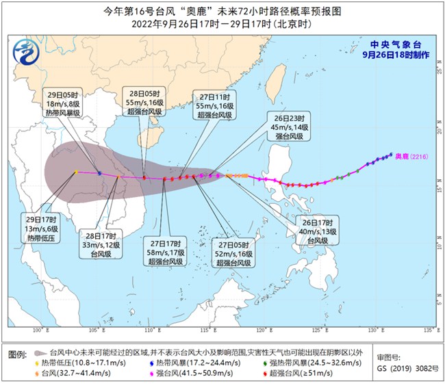 >>预计,“奥鹿”将以每小时25公里左右的速度向偏西方向移动,强度逐渐加强,并将再次加强为超强台风级,掠过中沙群岛、西沙群岛南部海域后,将于28日早晨到中午在越南中部沿海登陆(48-55米/秒,15-16级,强台风级或超强台风级),登陆后强度逐渐减弱。