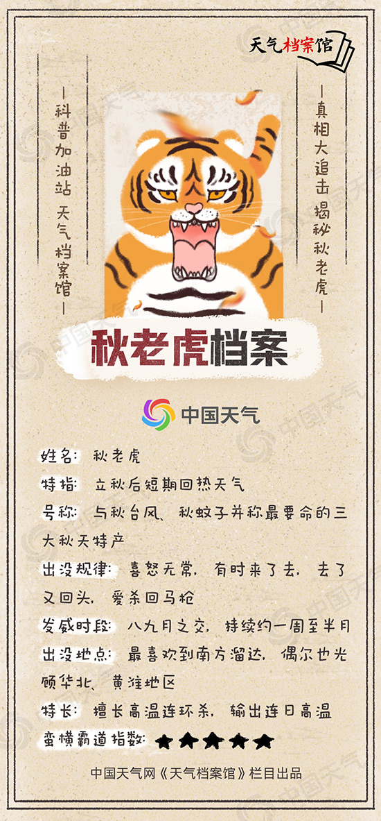 嗷呜~大家好,我叫秋老虎,特指立秋后短期回热天气,与秋台风、秋蚊子并称最要命的三大秋天特产。当8、9月之交秋凉慢慢靠近时,正是我出山之时。我最早下山是在8月底到9月初,最晚也拖到过9月中下旬到10月初。
